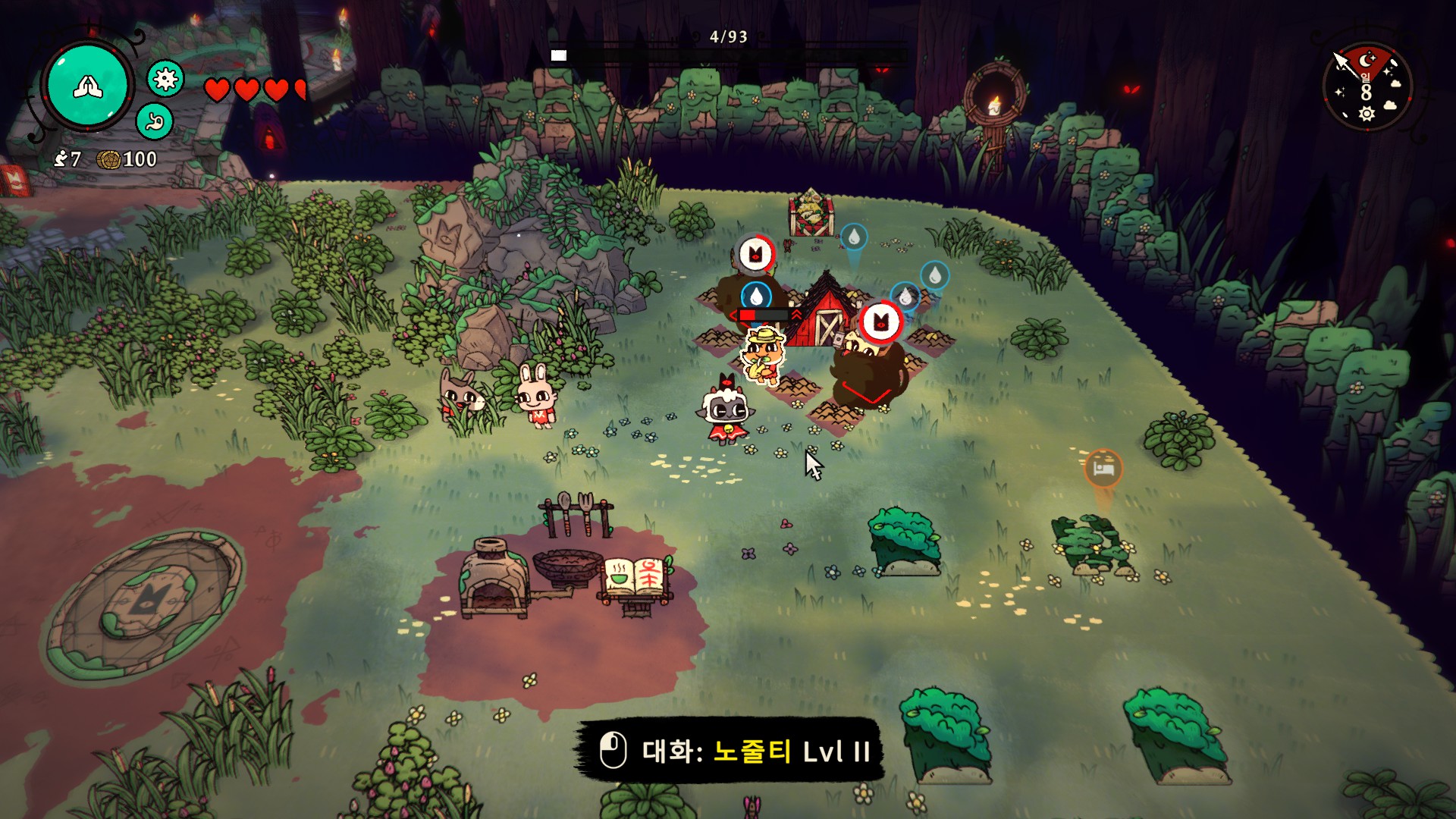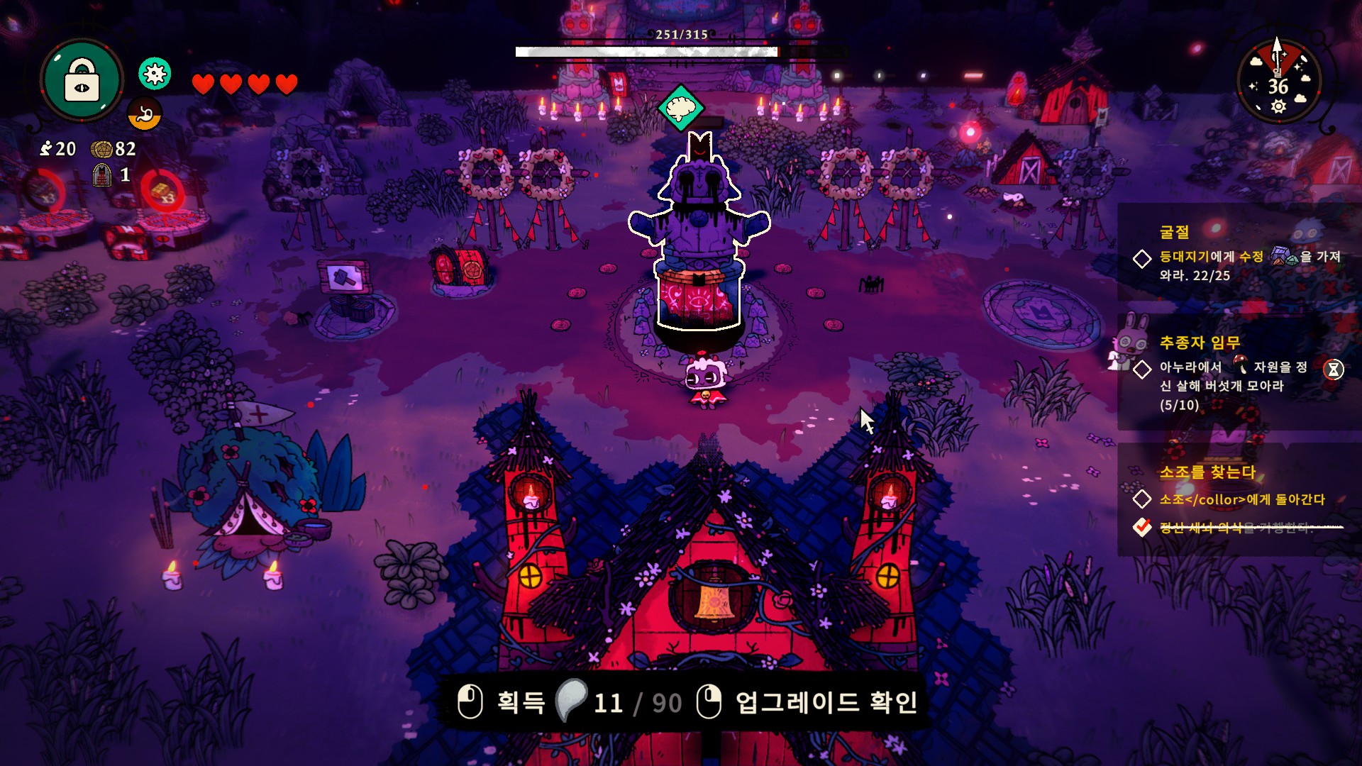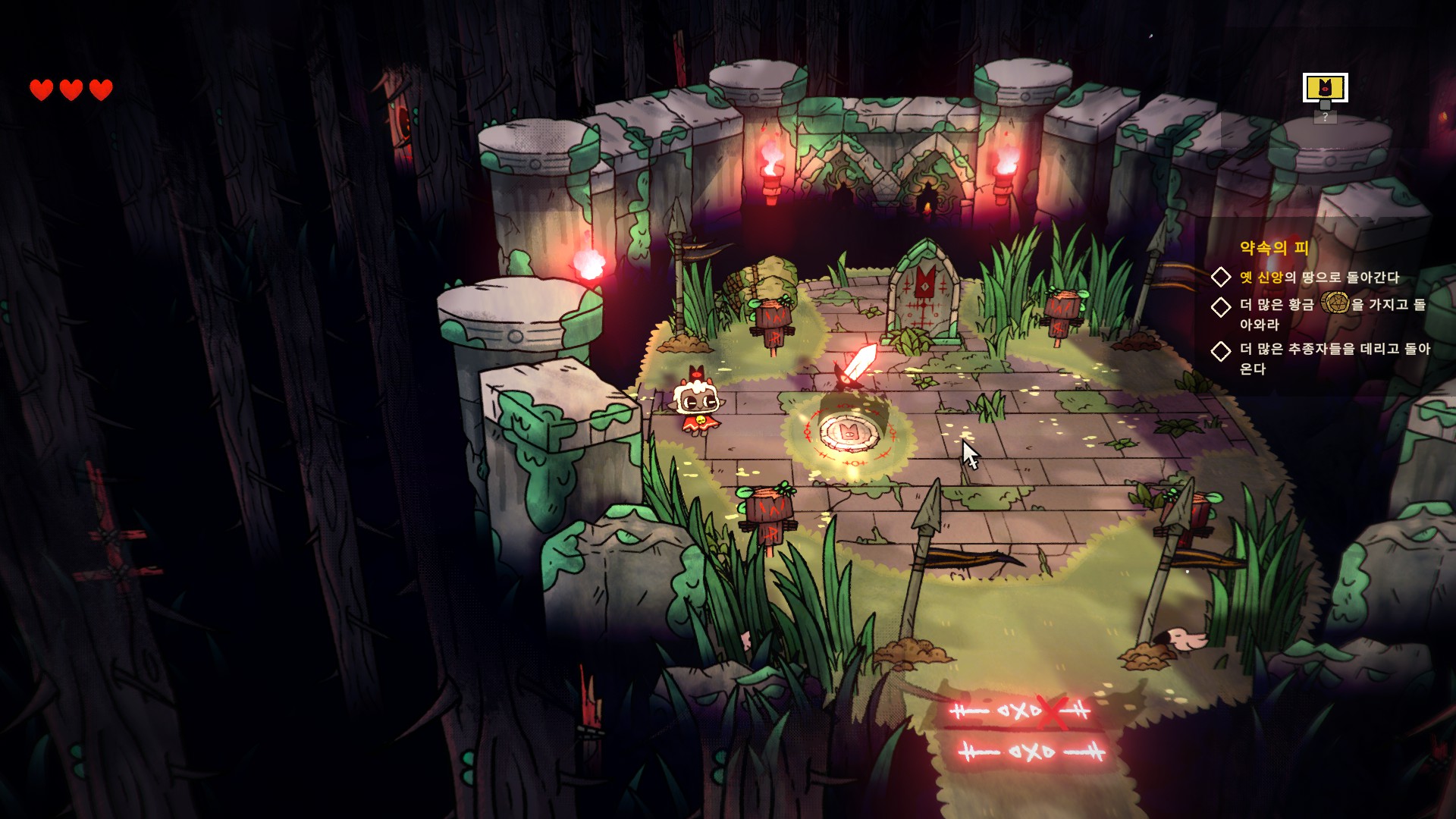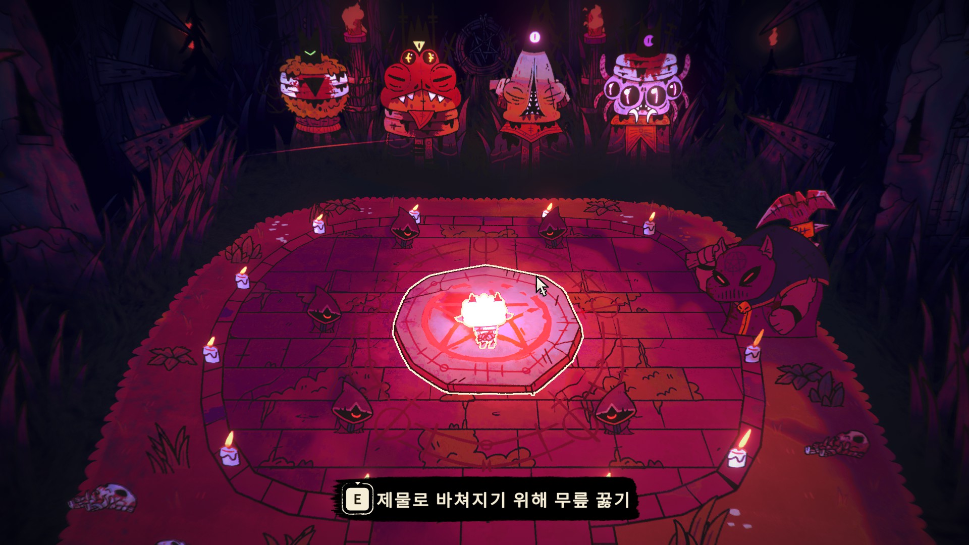 여기까지만 있다면 평범한 로그라이크류 게임이 되었겠지만 컬트 오브 램은 평범한 전투 플레이에 종교를 꾸려 나간다는 경영과 빌딩 요소를 결합했습니다.